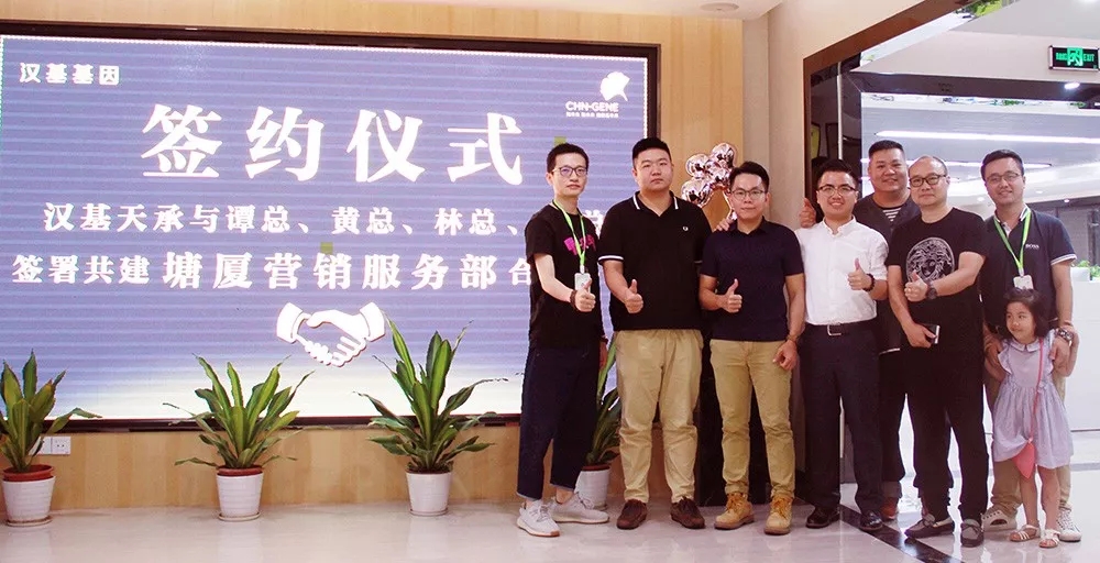 13號,漢基基因塘廈營銷服務部簽約儀式在漢基基因總部成功召開。廣東漢基天承基因科技有限公司(簡稱“漢基基因”)董事長楊政楠、副總裁陳相宇、副總裁周斌與黃奕捷先生、譚總、何總和林智龍先生成功簽署共建塘廈營銷服務部合作協議!