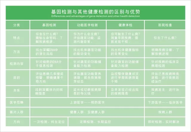 當dang我wo們men談tan及ji基ji因yin檢jian測ce時shi,總zong是shi容rong易yi混hun淆xiao其qi與yu傳chuan統tong體ti檢jian的de概gai念nian。事shi實shi上shang一yi種zhong疾ji病bing從cong開kai始shi到dao發fa病bing要yao經jing曆li很hen長chang的de時shi間jian,基ji因yin檢jian測ce與yu常chang規gui體ti檢jian都dou能neng起qi到dao預yu防fang的de作zuo用yong,但dan二er者zhe反fan映ying的de是shi不bu同tong的de階jie段duan。