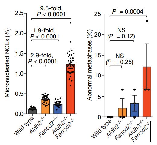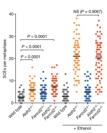 為了證實這一點,研究者搞了一批基因缺陷小鼠,給它們注射了酒精,並對骨髓細胞進行檢測。事實正如所料,不管是缺ALDH2還是FANCD2,又或者兩個都缺,DNA的不穩定性都大大上升,姐妹染色單體交換(SCEs)次數上升。給了酒精之後,SCEs更是暴漲4倍以上。