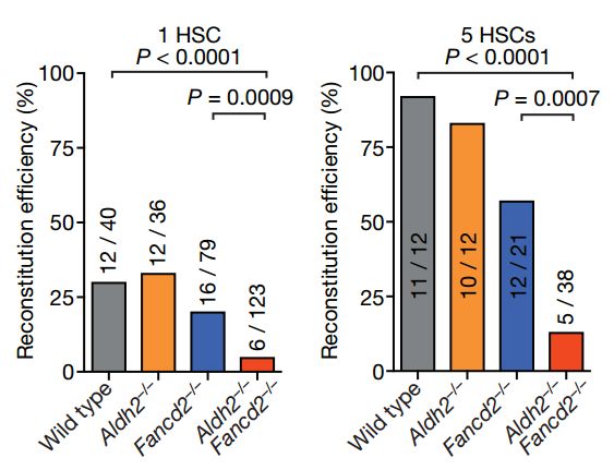 這兩道防線的配合真的是太重要了。本項研究的通訊作者Katen Patel教授在此前的研究中證實,同時敲除ALDH2和FANCD2,在給小鼠喂酒的情況下,DNA修複能力和對乙醛的抵抗力都降為了正常的1/600;就算不喝酒,小鼠也很容易產生癌症和造血功能障礙,甚至白血病[6]。