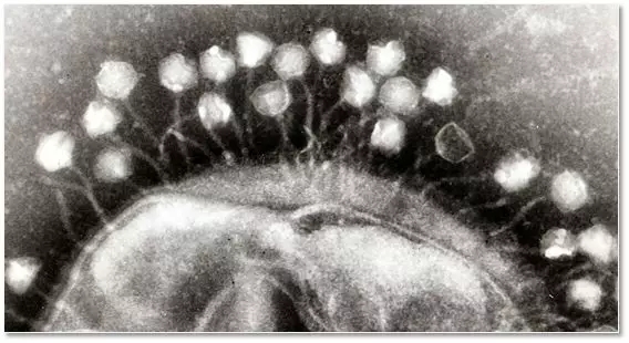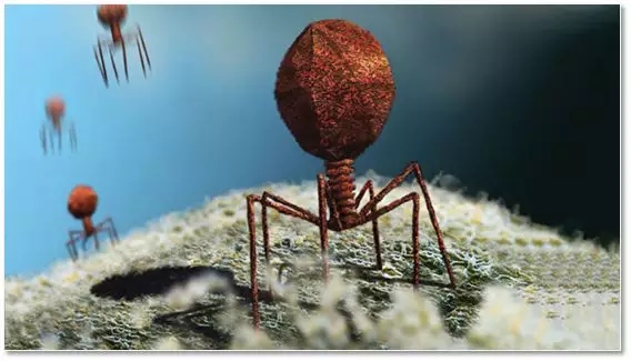 噬菌體的外形貌似科幻電影中的外星生物,一個大腦袋加八角蜘蛛一樣的腳,一旦附著在細菌表麵(不同的噬菌體針對不同的細菌),就將自己的核酸注入細菌,然後裂解細菌,複製自己。