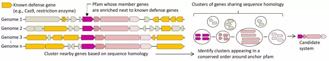 那麼,怎麼通過已知基因發現未知基因呢?研究者們設想,細菌的免疫係統抗擊噬菌體往往不會一個防禦基因(defense gene)單獨行動(比如Cas9或者某個限製性內切酶),而可能是一大堆臨近的基因家族一起行動,這zhe樣yang一yi來lai,已yi知zhi某mou個ge抗kang擊ji噬shi菌jun體ti的de基ji因yin之zhi後hou,在zai這zhe個ge基ji因yin的de周zhou邊bian或huo者zhe離li這zhe個ge基ji因yin不bu遠yuan的de基ji因yin組zu位wei置zhi上shang,也ye必bi定ding存cun在zai其qi他ta的de這zhe個ge基ji因yin家jia族zu相xiang關guan的de防fang禦yu基ji因yin。因yin此ci,隻zhi需xu要yao把ba不bu同tong的de細xi菌jun的de基ji因yin組zu放fang在zai一yi起qi來lai進jin行xing序xu列lie比bi對dui,就jiu能neng發fa現xian序xu列lie同tong源yuan的de基ji因yin,最zui後hou再zai把ba臨lin近jin的de同tong源yuan基ji因yin拚pin接jie起qi來lai,就jiu能neng夠gou組zu裝zhuang成cheng候hou選xuan的de細xi菌jun免mian疫yi係xi統tong了le。