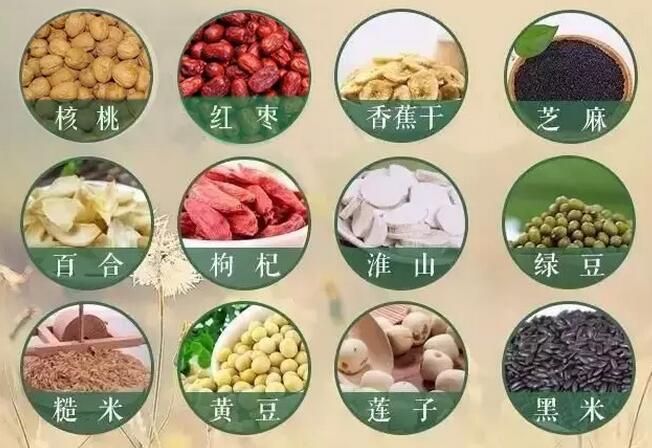 蓮子、綠豆、枸杞、山藥、百合、紅棗、芝麻、核桃仁、糙米、香蕉幹。