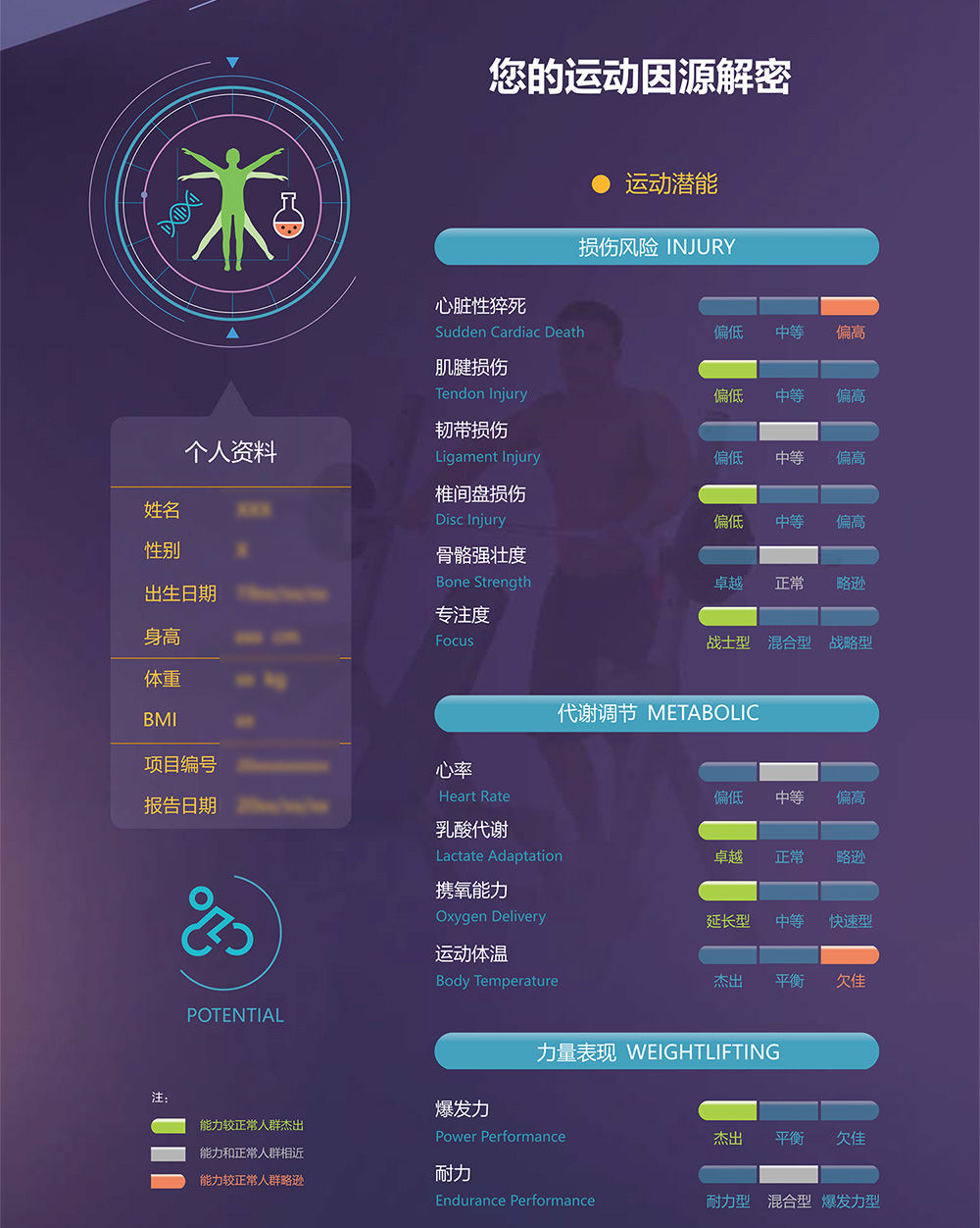 運動因源檢測一共有25項,以yi上shang隻zhi是shi我wo的de運yun動dong基ji因yin報bao告gao的de部bu分fen截jie取qu,通tong過guo這zhe項xiang黑hei科ke技ji檢jian測ce讓rang我wo在zai減jian肥fei路lu上shang少shao走zou很hen多duo彎wan路lu,讓rang我wo能neng找zhao到dao最zui適shi合he自zi己ji的de減jian肥fei方fang法fa和he選xuan擇ze合he理li的de飲yin食shi。