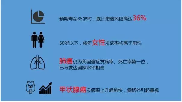 大多數人在40歲之後癌症發病率快速提升,80歲達到高峰;肺癌為發病率、死亡率雙率第一;甲狀腺癌快速上升;死亡率排前的癌症主要是肺癌和消化係統癌症。