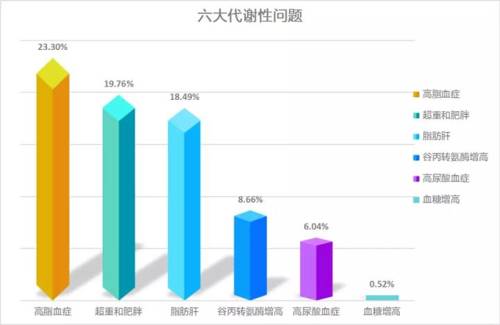 每5個人中就有1個高脂血症者;每10個人中就有1.8個脂肪肝;每20個人中就有1.04人血糖偏高。看著團檢報告上的這組數據,理論上,無論是高脂血症,還是高血糖都是好發於中老年人的代謝性問題,如高脂血症的發病高峰在50歲-69歲。